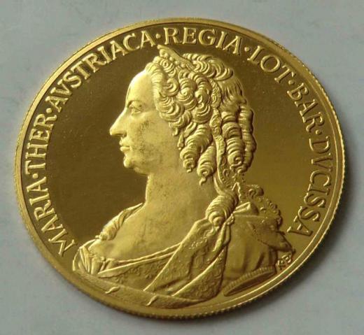 Zlatý 4 dukát Marie Terezie, novoražba z 2. poloviny 20. století. Au 986, váha 13,97 g, průměr 33 mm. Vroubkovaná  hrana. Kvalita Proof. Mincovna Kremnica. Hledaná mince.