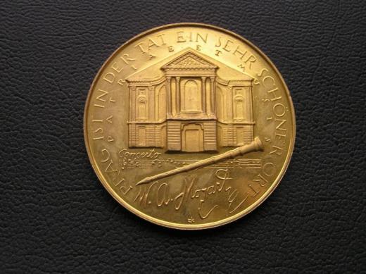 Portrét W. A. Mozarta, silueta Prahy / Divadlo, notový zápis, podpis.