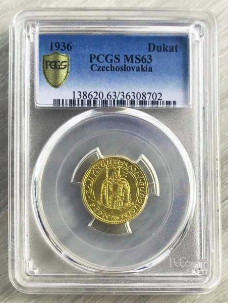 Svatováclavský Dukát 1936 R v certifikaci PCGS MS 63. Au 986 (dukátové zlato 23,7 karátů) - 3,49 g - mincovna Kremnica - poslední dostupný ročník - náklad pouze 14 500 kusů !! - certifikace PCGS = záruka pravosti a jakosti - pouze 5 mincí má v této certifikaci vyšší hodnocení. Poštovné po platbě předem 160 Kč, dobírka 230 Kč. Poštovné za dobírku požaduji předem. Možnost osobního převzetí a platby v Bílovci.