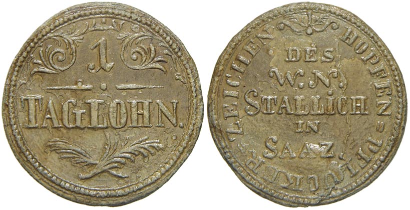 Žatec (Saaz). W. N. Stallich, 1 taglohn. Olovo 30 mm. Cajthaml-1726, Don.-5143. zaponový lak