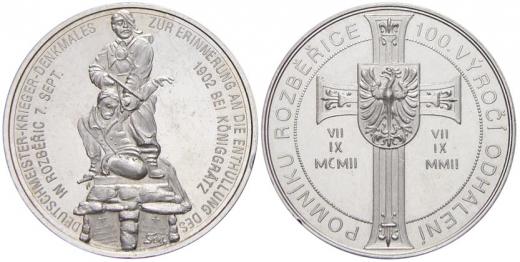 Rozběřice (okr. Hradec Králové). 100. výr. odhalení pomníku v Rozběřicích 1902 - 2002 padlým vojákům v bitvě u HK 1866. Socha dvou vojáků, něm. opis / kříž, data, český opis. Sign. Soušek. Cu lesklá 30 mm, síla střížku 2,5 mm (raženo 35 ks). Lit.: Sběratelské zprávy č. 130, str. 262-263. n. hr.