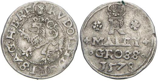Malý groš 1578 Jáchymov - Kádner, líc provazcovitý kruh. HN-1b, opis 7b