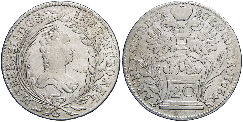 20 krejcar 1766 Vídeň (bez závoje, uprav. razidlo z r. 1765). Nov.-79. dr. škr.