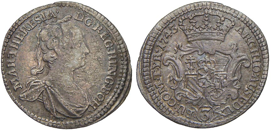3 krejcar 1743 Praha. Nov.-56. n. vada mat. na líci