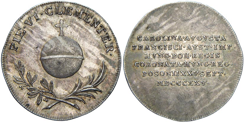 Velký žeton na korunovaci uherskou královnou Karoliny Augusty (4. manželka Františka II.) v Bratislavě 25.9.1825. Šestiřádkový nápis / říšské jablko, větvičky, opis PIE VT CLEMENTER. Nesign. Ag 25 mm. Novák-V/XVII/V1b. vlas. rysky, patina