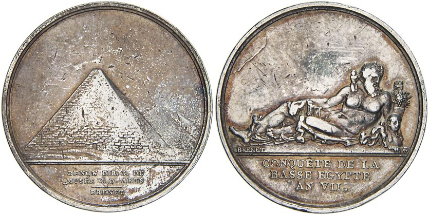 Dobytí dolního Egypta. Sedící Nil, nápis / pyramida, nápis. Sign. Brenet. Ag 33 mm, původní ražba. n. hr. R