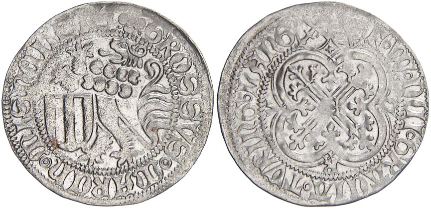 Fridrich II., Vilém III. (1440-64). Mečový groš, ražba z let 1457-64, minc. Freiberg (dva štíty). Krug-1079/8. n. nedor.