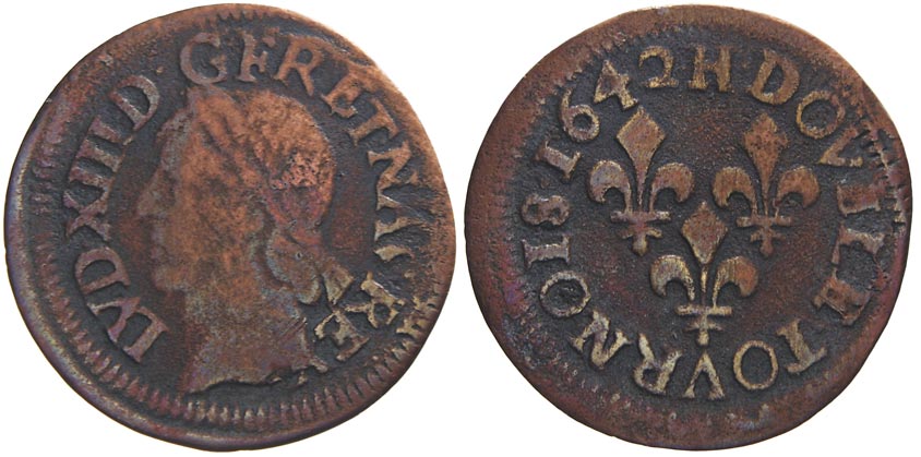 Ludvík XIII. (1610-43). Double tournois 1642 H. KM-127.6