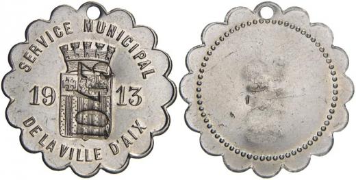 Psí známka města D'Aix 1913, ev.č. 1043. CuNi jednostr. 27 mm