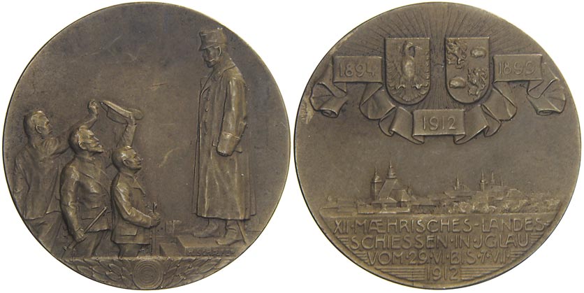 XII. ročník jihomoravských střel. závodů 1912. Dva znaky, letopočty, pohled na město, nápis / tři střelci před císařem. Sign. Schaefer. Bronz 38 mm