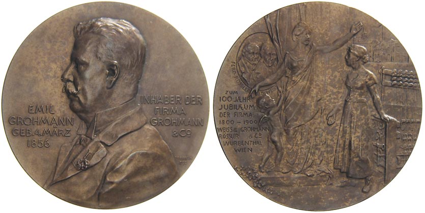 100 let firmy Grohmann & Co. 1800 - 1900. Portrét Emila Grohmanna, nápisy / alegorické postavy, drobný nápis. Sign. Pawlik. Bronz 51 mm