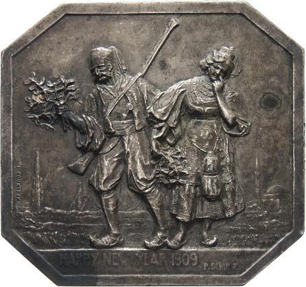 P. Schulz, novoročenka na rok 1909. Muž a žena v orientálních oblecích, dvě města, anglický nápis HAPPY NEW YEAR 1909. Bronz postř. jednostr. osmiúhelník 65x60 mm. skvrnky, patina