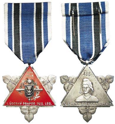 Pam. med. 1. úderného praporu ruských legií, čísl. (č. 486). Bronz postř., smalty, stuha, pův. etue