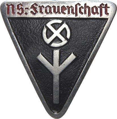 Odznak ženského spolku NS. Trojúhelník z bílého kovu, černěn, spona, zn. výrobcem s č. M1/101