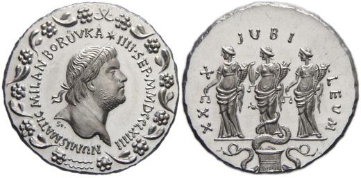 Soukromé numismatické ražby. Milan Borůvka (sběratel z Jaroměře). Žeton k 30. narozeninám 2011. Ve věnci portrét a opis / tři stojící Monety, koš s hady, opis. Sign. Soušek. Sn lesklý 29 mm, 8,70 g. Lit.: SZ 136-137/2013, str. 142