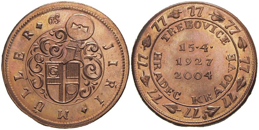 Žeton k 77. narozeninám 2004. Uprostřed data, opisy / osobní znak, opis. Sign. PS (Soušek). Měď 28 mm, raž. 41 ks