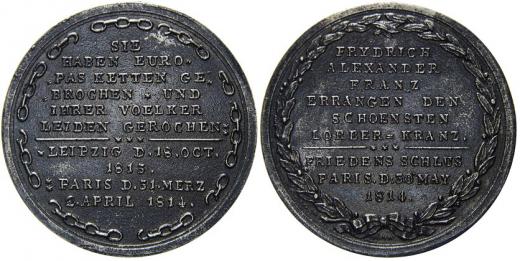 Rakousko. Vítězství spojenců nad Napoleonem I. a obsazení Paříže 1814. Ve věnci 9-ti řádkový něm. nápis / 10-ti řádkový něm. nápis ve věnci z roztrhaného řetězu. Autor Lerch, slévárny Zbiroh. Fe 53 mm černěné, 26,61 g. Ampach-11761, MN-1852, ČS-1447, MZČ-137/1