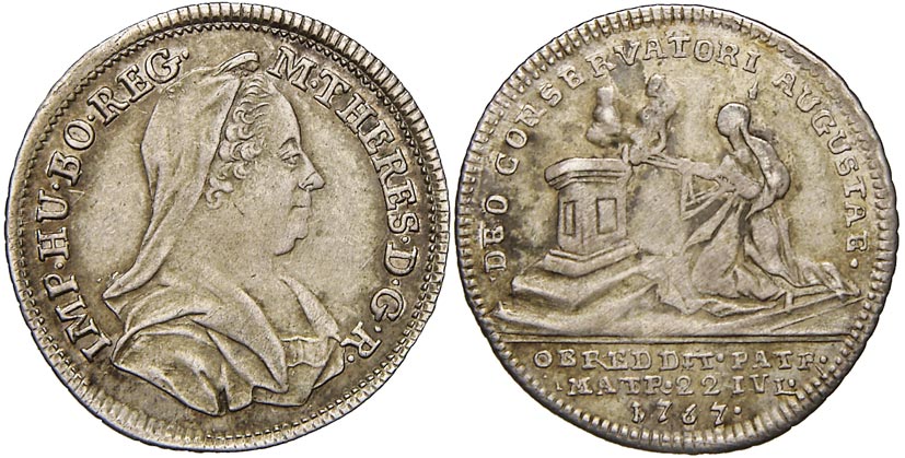 Menší jeton na uzdravení od neštovic 22.IV.1767. Portrét, opis / císařovna klečící před oltářem, opis a nápis. Autor Widemann. Ag 21mm, 1,78 g. ČS-1368