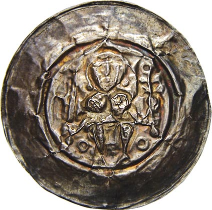 Waldenburg, hrabství. Konrád (U 1216). Velký brakteát (43 mm), cca 1215, minc. Wolkenstein. Sedící panovník drží meč a ratolest, pod ním dva kroužky. Schwinkowski-467, Thieme-552. pomačkán, n. perfor.