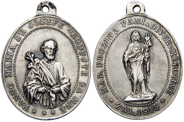 Mariánské družiny. Měrotín - družina paní a dívek, zal. 1915. Stojící Panna Marie, opis / sv. Josef, opis. Ag (2 puncy) ovál 34 x 28 mm (12,50 g), pův. ouško