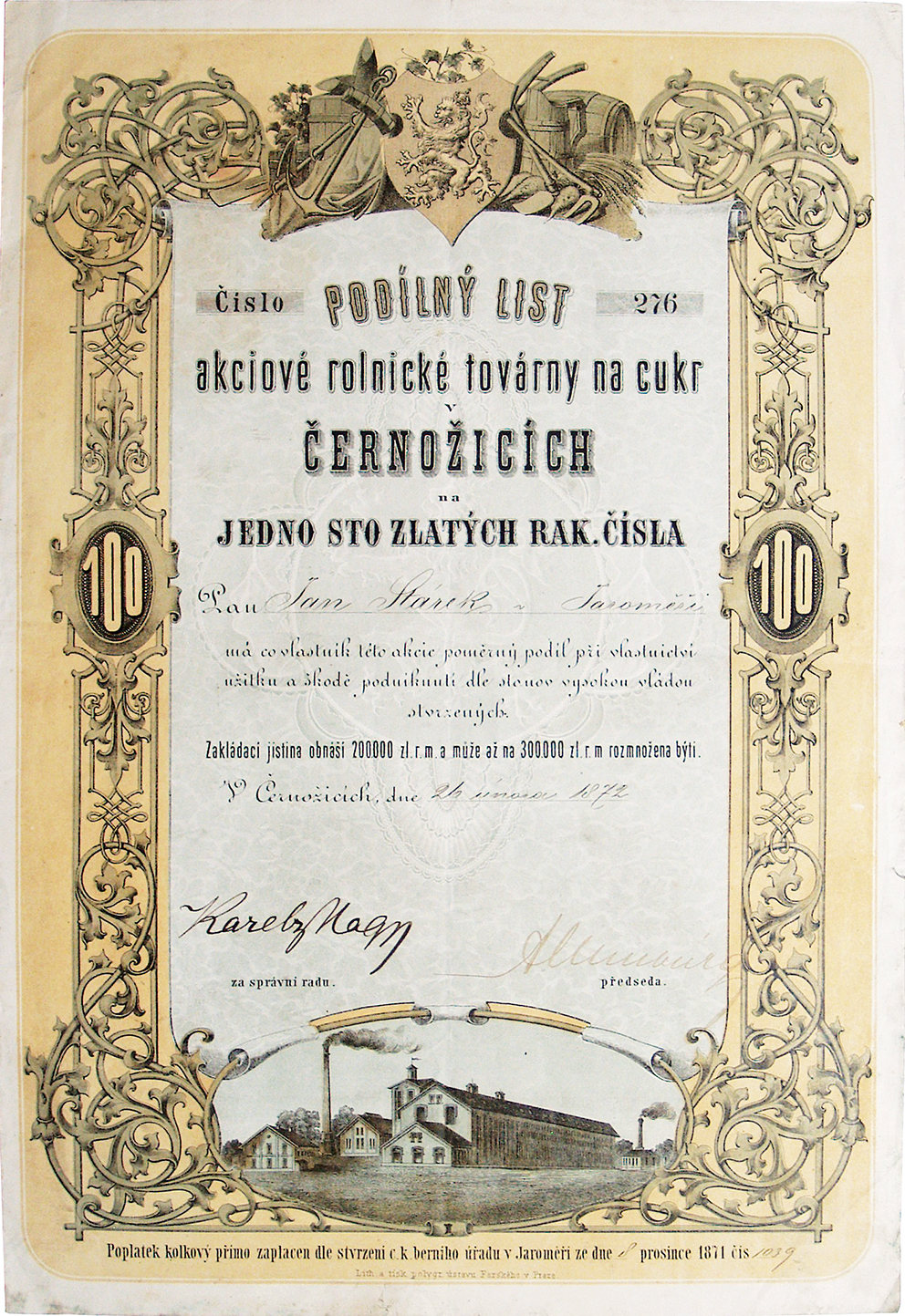 Podílný list akcioné rolnické továrny na cukr v Černožicích na 100 zlatých rak. čísla z 24.2.1872 R