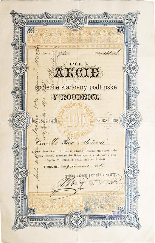 Půl akcie společné sladovny podřipské v Roudnici na 100 zlatých, Roudnice 9.7.1889 R