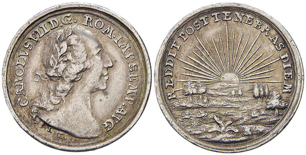Pamětní medaile b.l. (1742). Portrét, titulatura / vycházející slunce nad krajinou. Sign. J. L. Oexlein. Ag (2,99 g) 21 mm. Novák-III/XII/H.1b