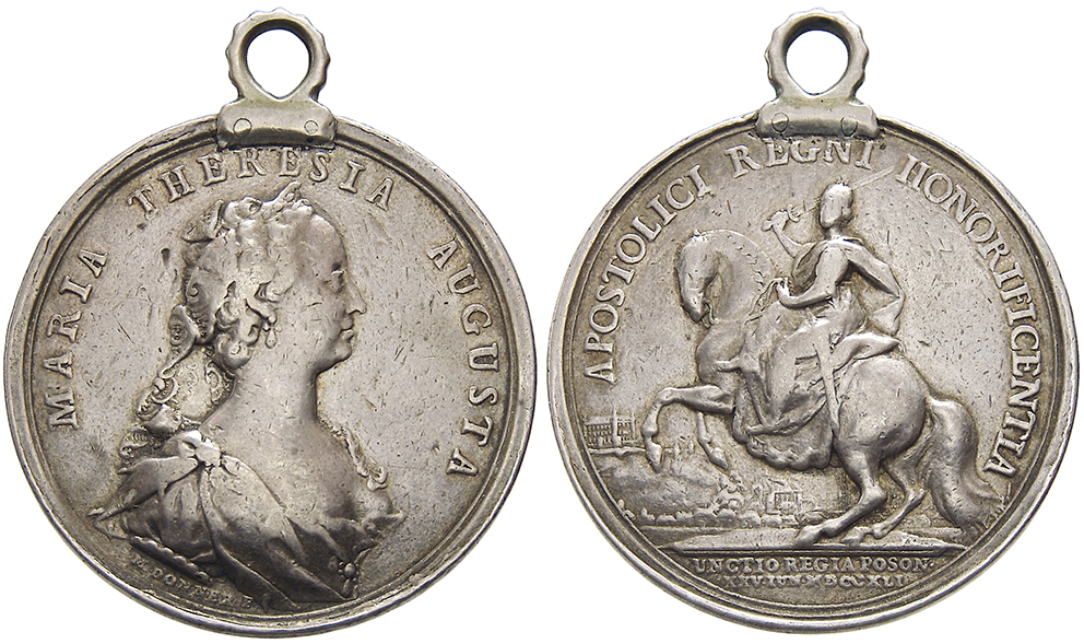 Medaile ke korunovaci na uherskou královnu 25.6.1741 v Bratislavě. Portrét, opis / M.T. na koni s mečem, opis, v úseči nápis. Sign. Donner. Ag 44 mm. Novák-IV/XIII/D8b. přičepované dobové ouško, n. škr.