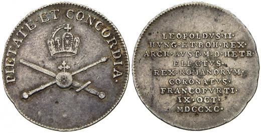 Malý žeton ke korunovaci na římského císaře 9.10.1790 ve Frankfurtu n.M. Devítiřádkový nápis / koruna, pod ní zkřížené žezlo, meč a říšské jablko, opis. Nesign. Ag (2,19 g) 20,5 mm. Novák-V/XVI/E11b