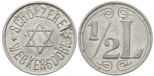 Křinice (Weckersdorf, okr. Náchod). Hostinec Schölzerei (Šolcovna), hodnota 1/2 L. Hliník 25,4 mm