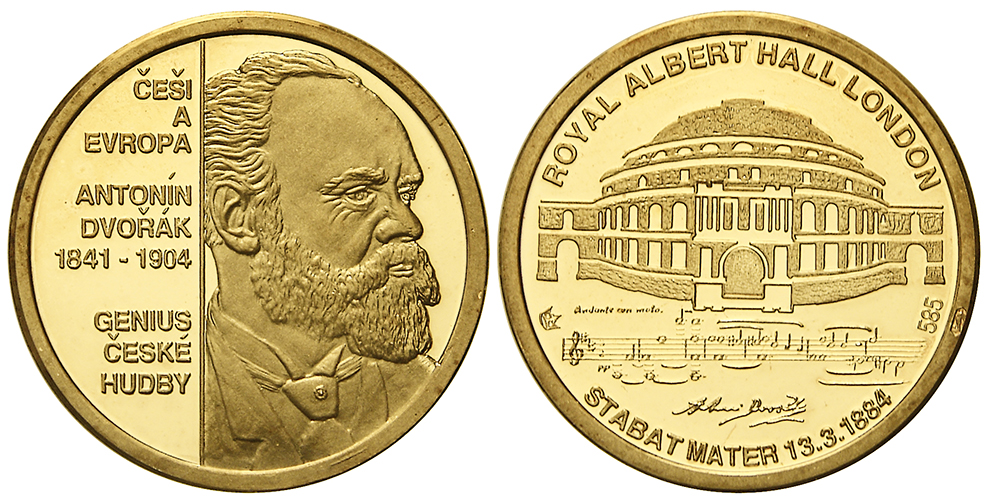 Antonín Dvořák. Portrét, nápisy / hudební hala v Londýně, noty, opis. Au 0.585 (3,49 g) 20 mm, čísl. certifikát (č. 18)