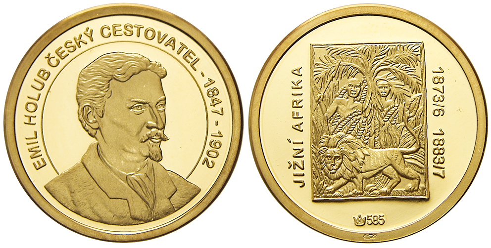 Emil Holub, cestovatel. Portrét, opis / lev a 2 domorodci, nápis JIŽNÍ AFRIKA 1873/6 1883/7. Au 0.585 (3,56 g) 20 mm, čísl. certifikát (č. 67)