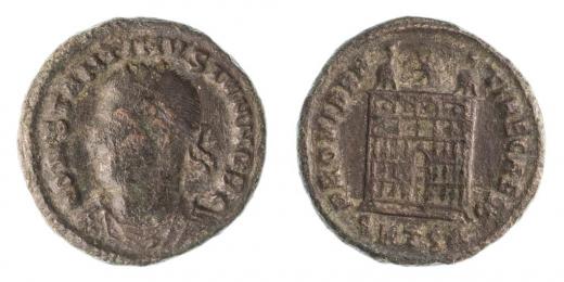Constantinus II.337-340 AE3L:portrét zleva R:pevnostní brána,Thessalonica