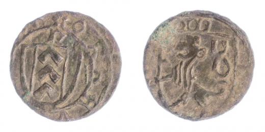 Opava, haléř 15.stol.erb ve štítě, opis OPAVIENSIS - varianta opisu / český lev Kopicki 8676, nad erbem v poli písmeno "n"