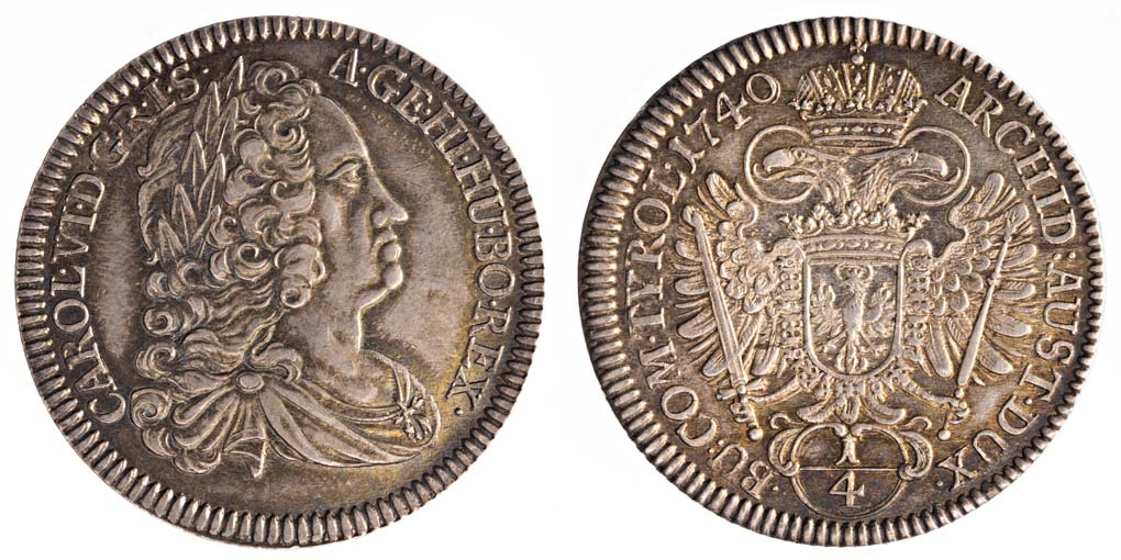 Tyroly, Karel VI.1711-1740 1/4tolar 1740 Hall M.A.240 6.98gr.