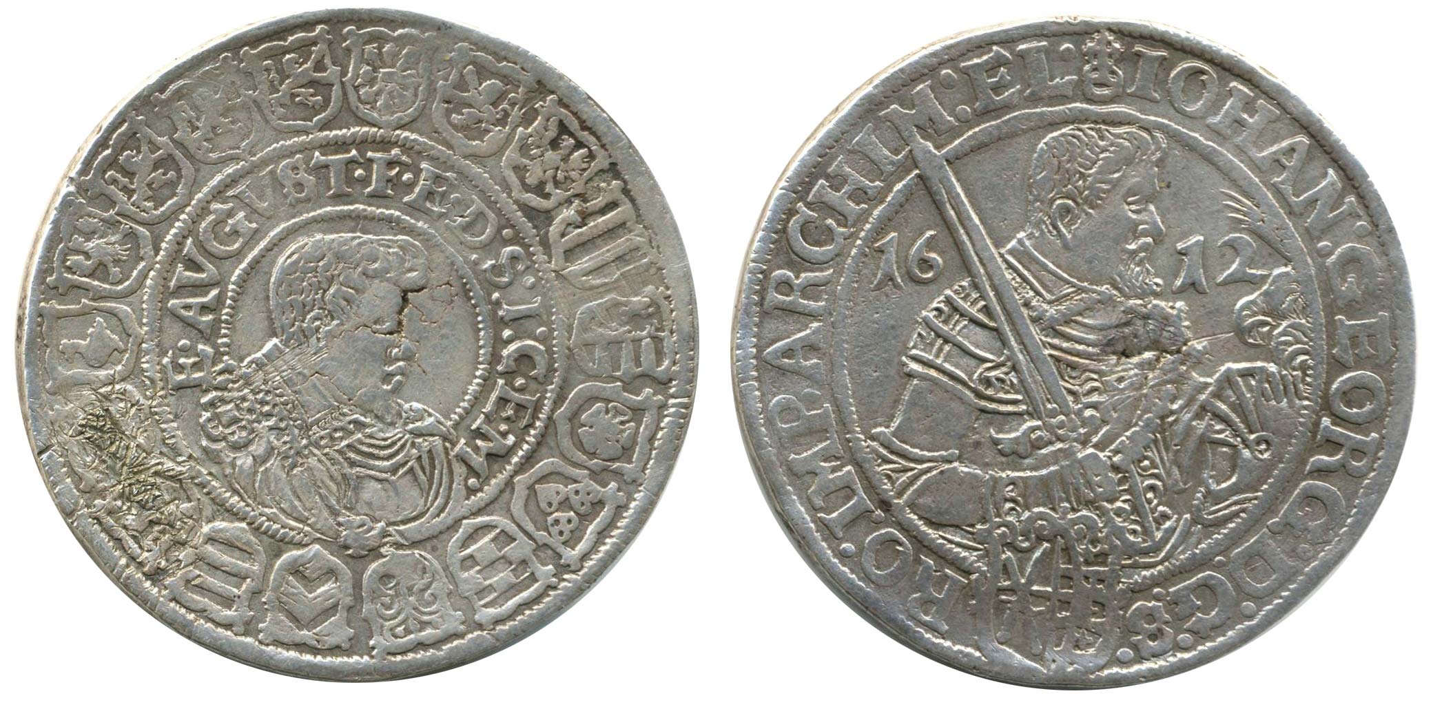 Sasko ,Johan Georg I.1591 - 1656 a August 1611 - 1615 tolar 1612 Drážďany Heinrich von Rehnen Dav.7573 vada kovu