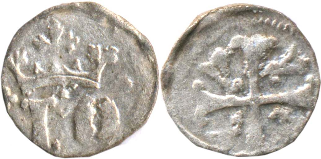 Morava, markrabě Jošt 1375-1411, denárový haléř JH 6 korunované IO / kříž s "y"