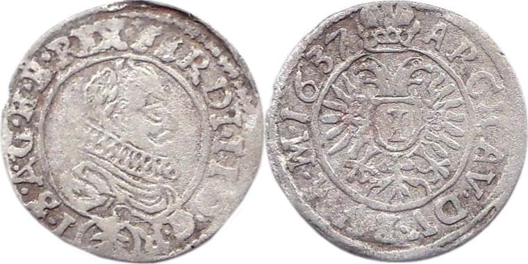 Ferdinand II. 1619-1637 1krej. 1637 Praha-Wolker, MKČ 764 nep.ned., mělčí ražba