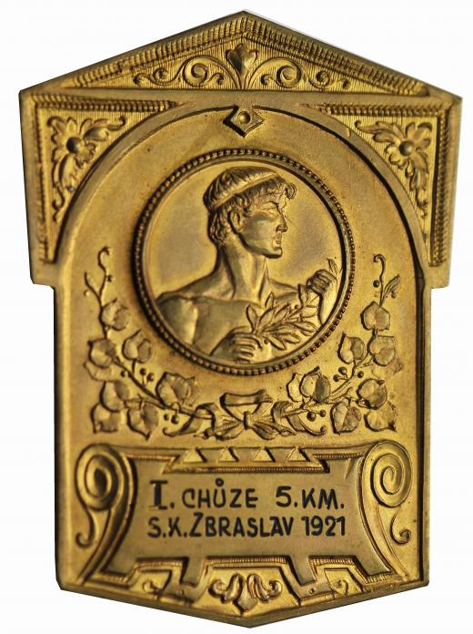 Sportovní cena, I. chůze 5 km S.K. Zbraslav 1921, plaketa bronz cca 67x50mm