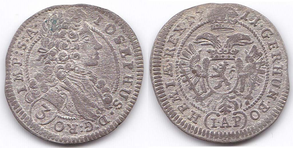 Josef I. 1705-1711, 3krej. 1711 I.A.P. Praha-Putz, var. IMP R