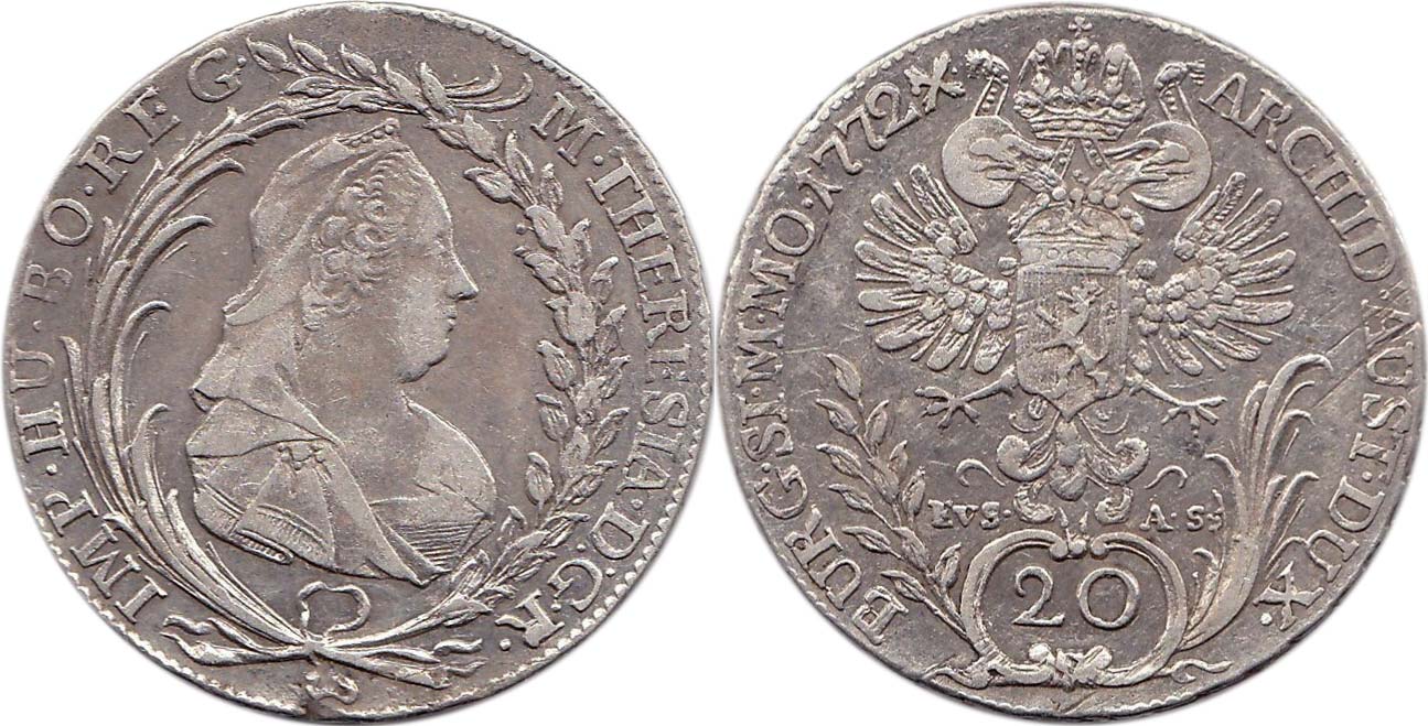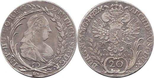 Marie Terezie 1740-1780, 20krej.1772 EvS-AS, Praha-Erdmann+Stöhr, MKČ 1953 dr.just.