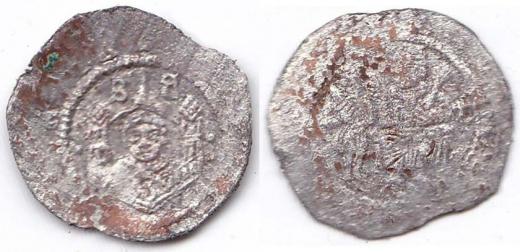 Vladislav II. 1140-1172, denár Cach 614, var.a), s písmeny B po stranách věže, nízký obsah Ag, prosvítá měď mírně nedor.