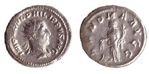 Antoninian. L: hlava s paprskovou korunou, zprava, IMP M IVL PHILIPPVS AVG, R: stojící Annona zprava, u obilnice a rohem hojnosti a klasem, ANNONA AVGG, minc. Řím,, 3,18 g. K5, RIC 28a, S 2453