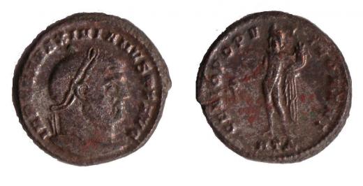 AE follis. L: ověnčená hlava zprava, IMP [C M A] MAXIMIANVS PF AVG, R: stojící Genius, drží roh hojnosti a pateru, GENIO POPV - LI ROMANI minc. Heracleia, 10,58 g. S 3533