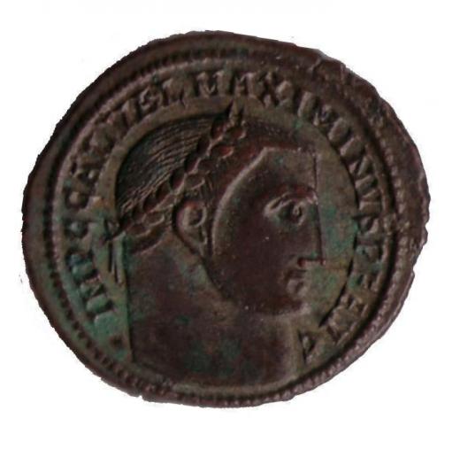 AE follis, L: ověnčená hlava zprava, IMP C GAL VAL MAXIMINVS PF AVG, R: stojící Genius, drží roh hojnostI a pateru, půměsíc, GENIO IMPERATORIS, KP ALE, Alexandria, 6,42 g. RIC 92A