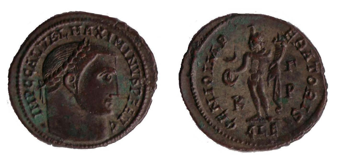 AE follis, L: ověnčená hlava zprava, IMP C GAL VAL MAXIMINVS PF AVG, R: stojící Genius, drží roh hojnostI a pateru, půměsíc, GENIO IMPERATORIS, KP ALE, Alexandria, 6,42 g. RIC 92A
