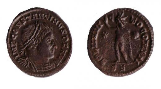AE follis malý, L: ověnčená hlava zprava, IMP CONSTANTINVS PF AVG, R: stojící Sol, drží globus, hvězda, SOLI INVI - CT - O COMITI, Trevor, 2,86 g. K 34 na R kor.