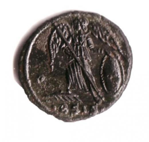 AE 3, L: hlava císaře v přílbě zleva, CONSTANTINOPO - LIS, R: Victoria na přídi lodi zleva, B SIS, Siscia, II. dílna, 2,58 g. S 3790, RIC 241