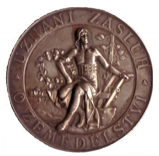 Zemědělská rada pro Království české, český odbor. Český lev v kartuši. / Přemysl Oráč sedící na pluhu, lípa a ratolestí, opis UZNÁNÍ ZÁSLUH O ZEMĚDĚLSTVÍ. V. R. Smolík, ryl Golčmíd. Ag, punc. A na hr, 56 mm. Pěkná patina. Původní etue.