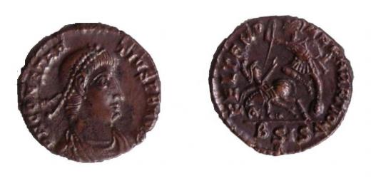 AE 17 mm, L: ověnčená hlava zprava, DN CONSTANTIVS PF AVG, R: voják poráží jezdce, FEL TEMP REPARATIO, Siscia, II. dílna, 2,76 g. S 3910